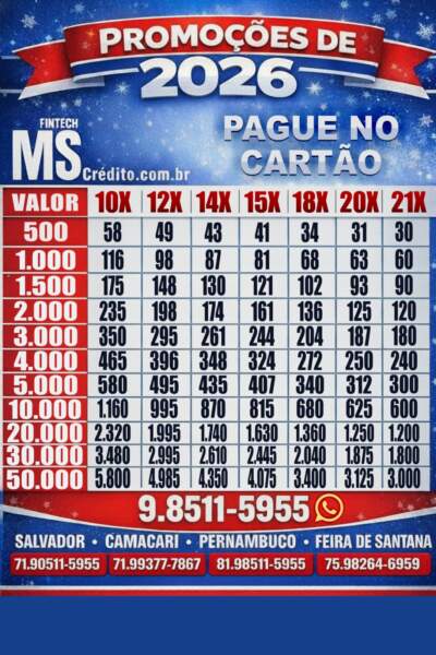 A taxa de juros praticada no produto de crédito pessoal é de 15% a.a. a 80% a.a.. ou 6,64% a.m. a 31,87% a.m. A MSCRED tem o compromisso de total transparência com nossos clientes. Nossa central de atendimento está disponível para esclarecimento de dúvidas sobre quaisquer dos valores apresentados.